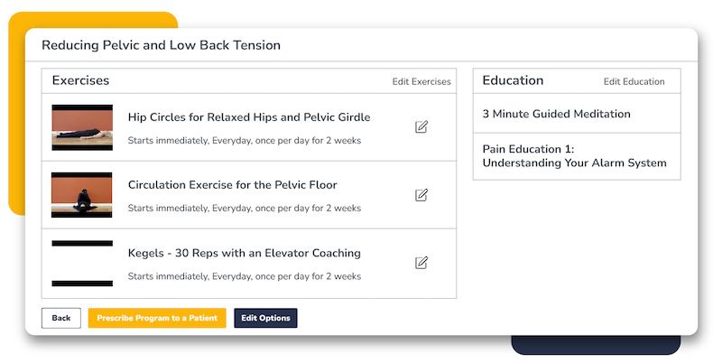 Embodia’s template feature allows for quick program prescription. Select a template and prescribe it to a patient. Adjust the program settings as needed, including reps, sets, resistance level, and hold (counted in seconds, minutes, or breaths!). You can select from Embodia’s library of templates or build your own.